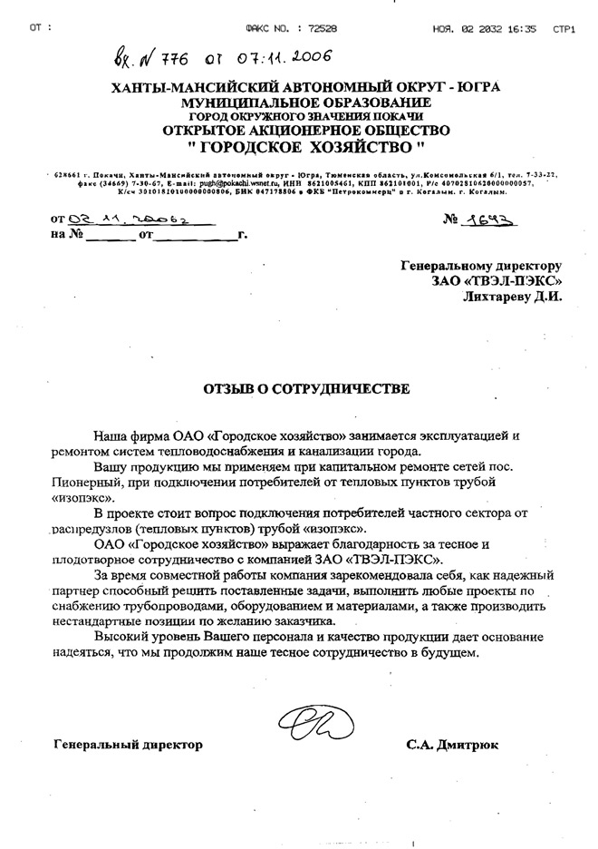 Завод Полимерных Труб зарекомендовал себя как надежный партнер, способный выполнять любые проекты Управляющая компания тепло-водоснабжения и канализации, г. Покачи ХМАО