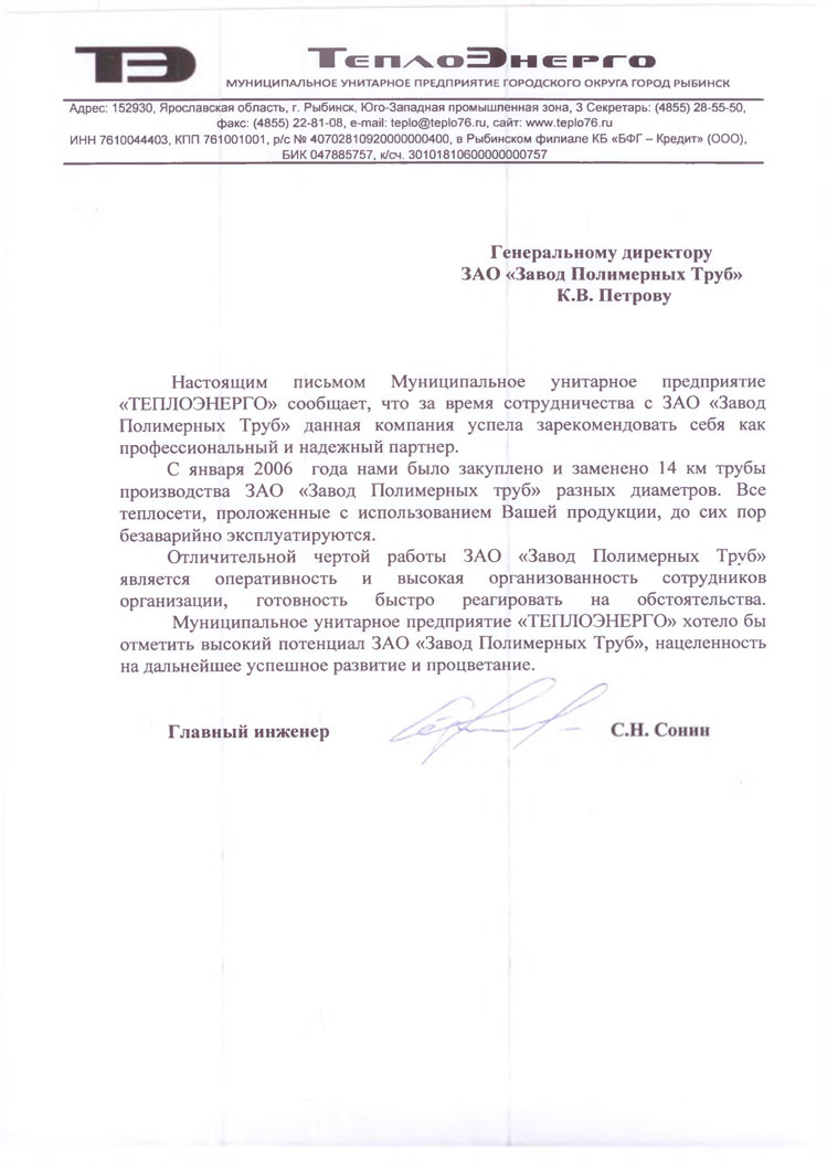 Все сети с 2006 года эксплуатируются безаварийно. Отличительной чертой компании является оперативность и организованность. МУП "Теплоэнерго", г.Рыбинск Ярославской обл.